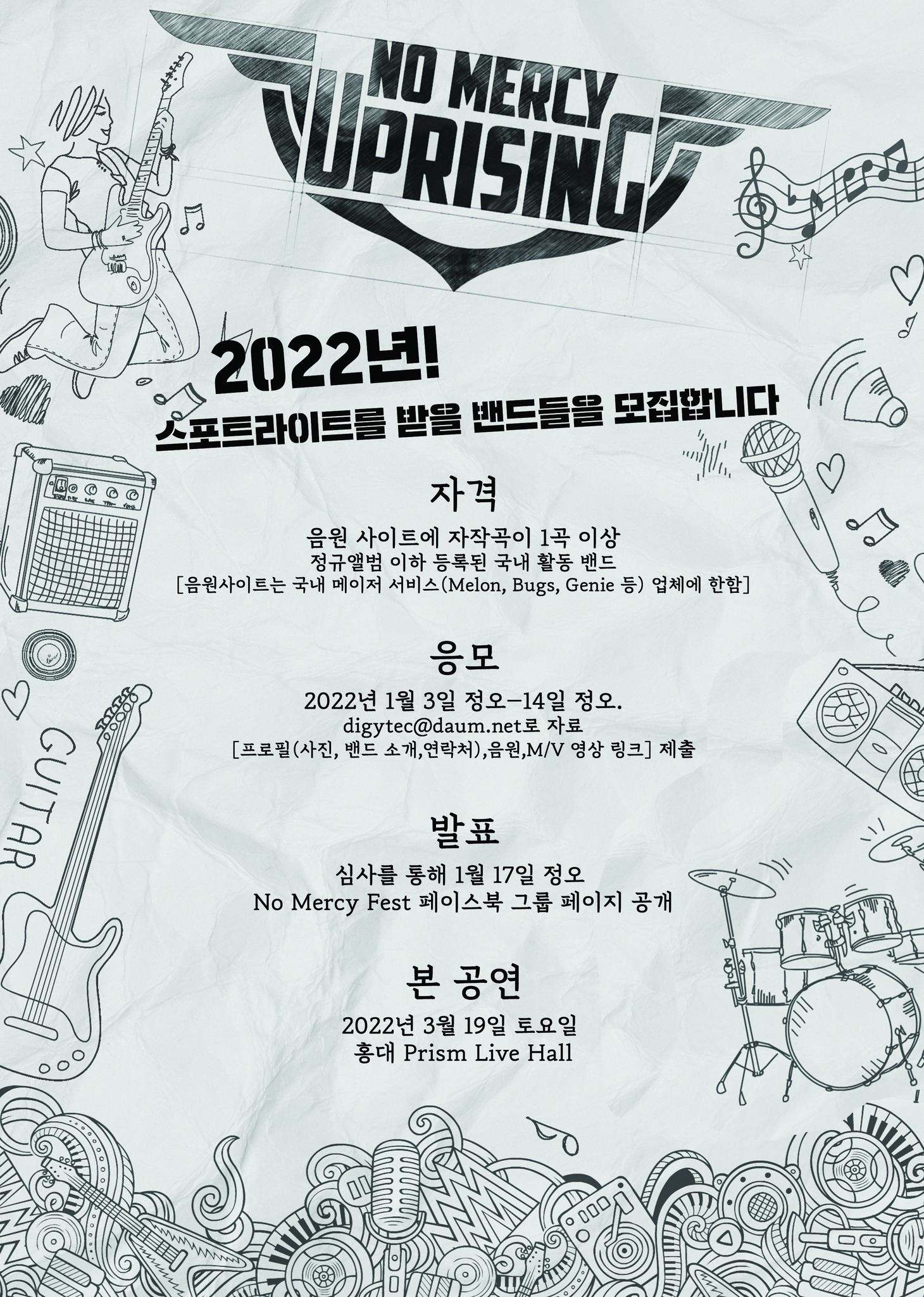 응모: 2022년 1월 3일~14일 정오까지 주최측 대표 아이디(digytec@daum.net)로 자료(프로필사진, 밴드 소개, 연락처, 음원, M/V 혹은 라이브 영상 링크) 제출
