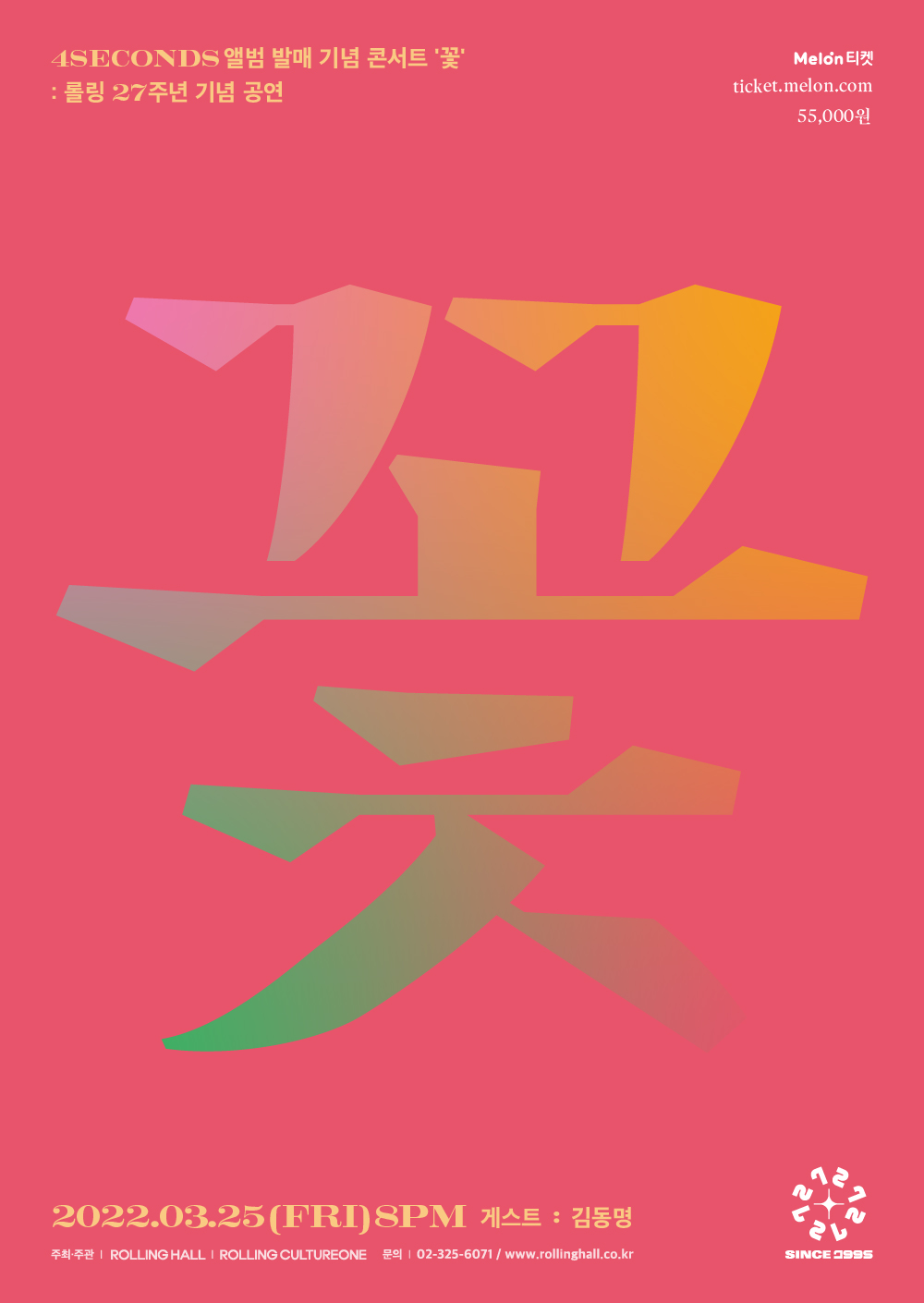 밴드 포세컨즈(4SECONDS)가 오는 25일 금요일 롤링홀 27주년 기념 단독공연을 한다. 지난 달 28일부터 멜론 티켓을 통해 예매가 시작되었으며, 시작과 동시에 멜론 티켓 예매 랭킹 4위에 오르는 등 많은 관심이 이어지고 있다. 소속사 스타더스트이앤엠은 “포세컨즈의 단독공연은 롤링홀 27주년 기념과 2022 리마스터 앨범 [꽃] 발매를 기념하기 위해 내달 25일 오후 8시 개최된다. 신종 코로나바이러스 감염증(코로나-19) 확산 방지를 위해 철저한 방역 지침 준수 하에 진행될 예정이며 멜론티켓 구매 및 현장 판매를 통해 참여 가능하다”고 28일 밝혔다.