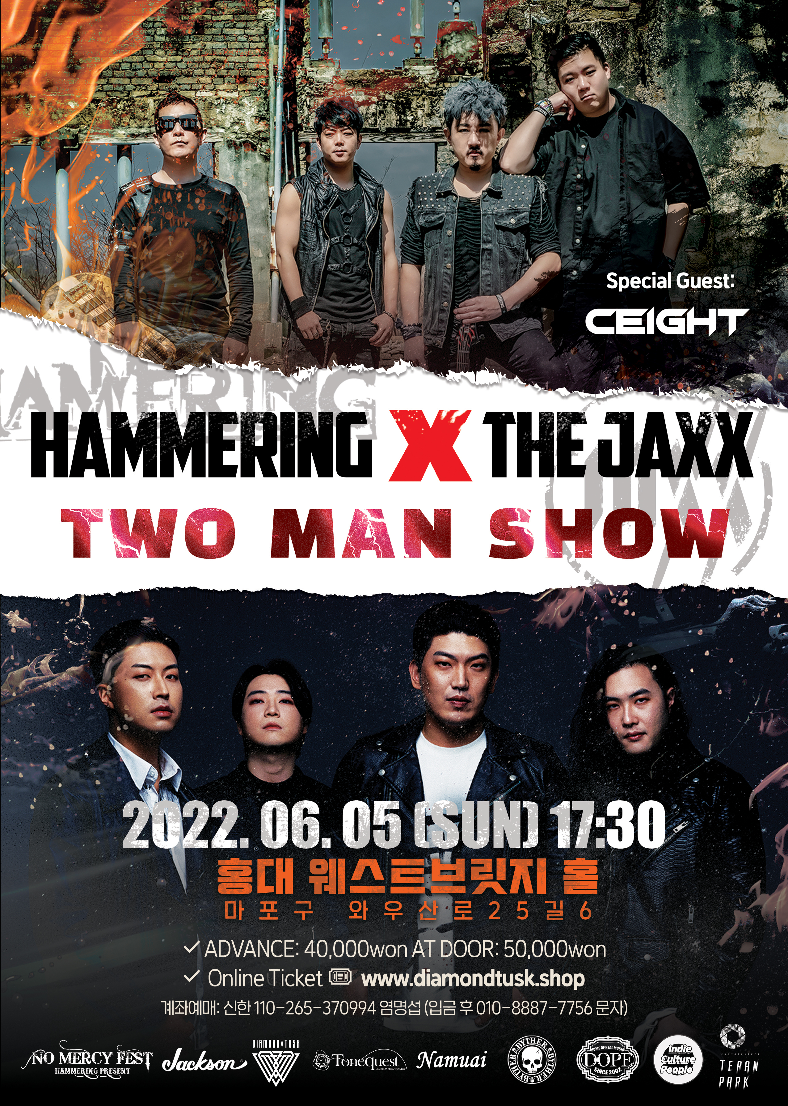오는 2022년 6월 5일, 홍대 앞 웨스트브릿지 라이브홀에서 막강한 화력을 자랑하는 두 밴드의 합동 공연이 열린다. 지난해 말 정규앨범 [New World]를 발표했지만 코로나-19라는 상황에 묶여 제대로 된 공연 한 번 펼치지 못했던 더 잭스(The Jaxx)와 얼마 전 한국대중음악상 최우수 메탈 & 하드코어 음반부문에 노미네이트됐던 [Libera Me]의 리미티드 에디션 박스세트를 발표한 해머링(Hammering)이 그 주인공이다.