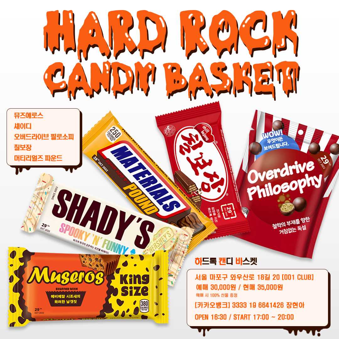 길었던 팬데믹을 뚫고 공연계가 다시 힘차게 요동치는 가운데 새로운 브랜드 공연 하드록 캔디 바스켓(Hardrock Candy Basket)이 관심을 모으고 있다. 오는 2022년 10월 29일, 홍대 001클럽에서 열릴 예정으로 있는 하드록 캔디 바스켓은 어느덧 ‘홍대 명절’로 자리 잡은 할로윈과 연계해 진행된다. 특히나 주목 할 점은 이번 공연 라인업이 각 세대의 어우러짐을 목표로 꾸려졌으며, 앞으로도 이 공연-하드록 캔디 바스켓-은 인디 공연 문화의 미래를 위해 공존과 화합의 장을 여는 것을 최우선 과제로 둔다는 것이다.