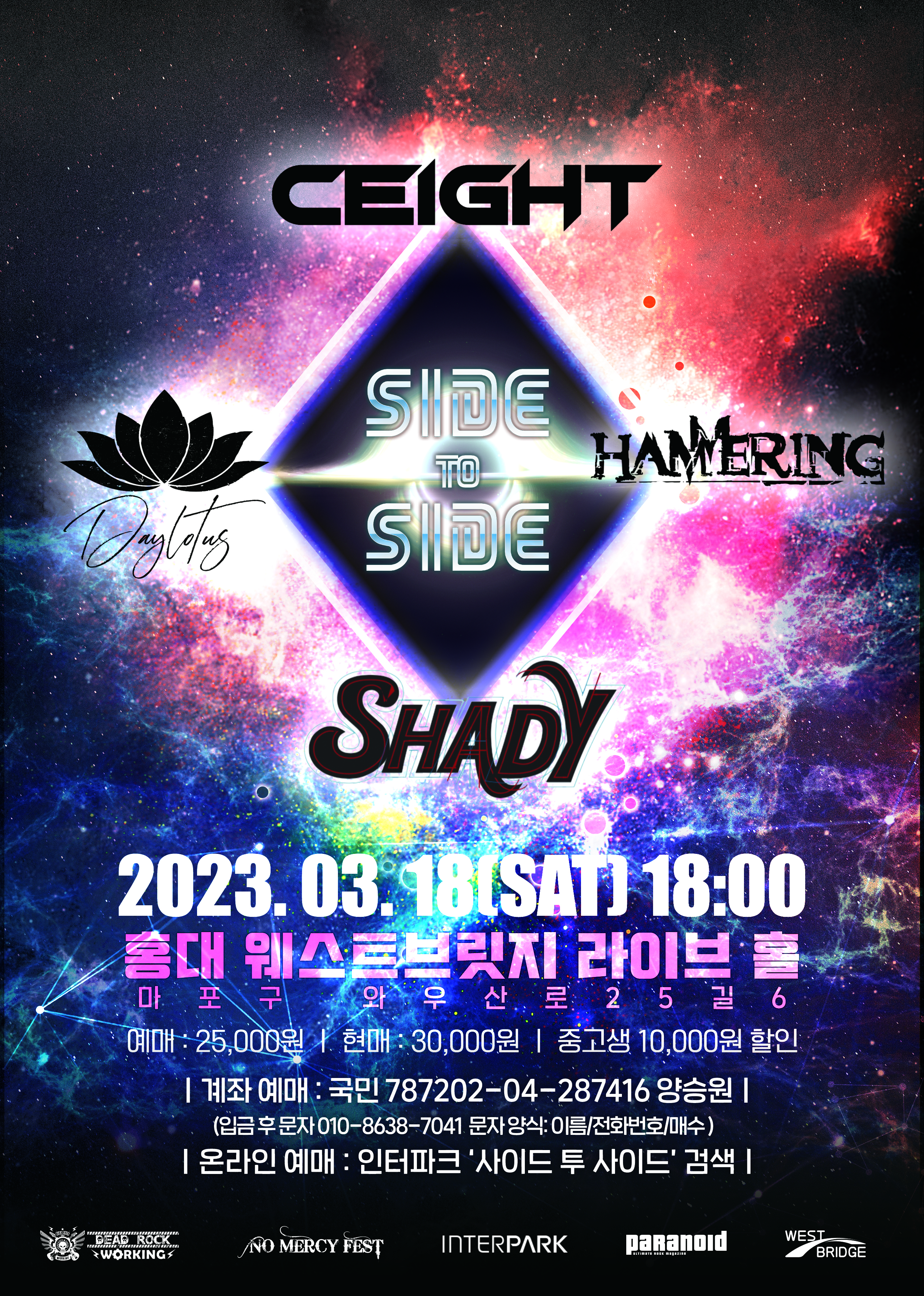 2023년 혜성처럼 나타난 세이트(Ceight)와 셰이디(Shady)가 ‘2023 사이드 투 사이드(Side To Side) [Ceight × Shady]’라는 타이틀로 미니 단독공연을 개최한다. 두 밴드는 신예 밴드답게 엄청난 열정과 투지로 이번 공연을 준비 해왔으며, 메탈계에서 가장 핫한 밴드인 해머링(Hammering)과 최강 비주얼록 밴드인 데이로터스(Daylotus)가 이들을 서포트 한다.