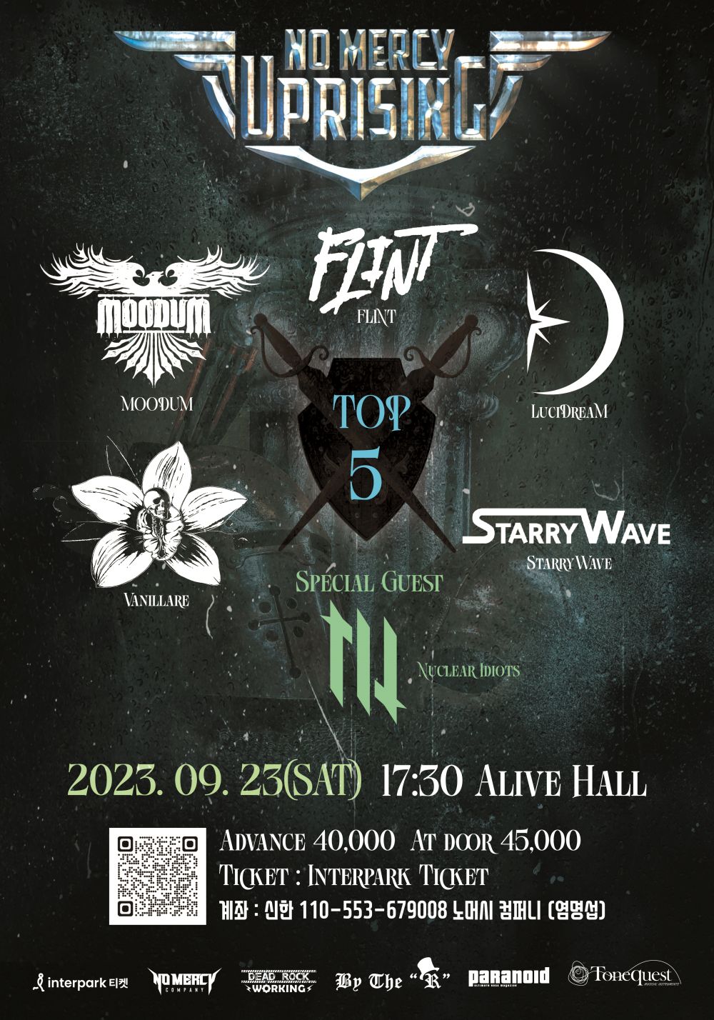 노머시 브랜드로 개최되고 있는 노머시 업라이징(No Mercy Uprising)이 어느덧 7년차를 맞이했다. 이번에 개최되는 노머시 업라이징 2023은 노머시 컴퍼니 레이블 설립 후 보다 전문화되고 확장된 프로그램으로 진행될 것으로 예상된다. 노머시 업라이징 2023은 1차 온라인 응모를 통해 결선 5개 밴드가 선정됐고, 9월 23일 본 공연 후 관객 투표(70%)와 심사위원(30%)의 심사를 합산하여 순위를 정하는 서바이벌 콘서트로 진행된다. 행사는 후보들의 경연과 스페셜 게스트 뉴클리어 이디엇츠(Nuclear Idiots)의 축하공연으로 꾸며질 예정이다.