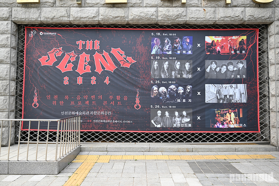 인천은 한국에서 부산과 함께 나름 ‘로컬 록 음악 신’이란 것이 존재했던 곳이었고, 동인천의 영상 음악 감상실과 작은 공연장, 배다리의 음악학원, 그리고 관교동 상가 지하실들을 채웠던 밴드들의 연습실을 통해 1980년대 중반부터 1990년대 중반까지 활발한 록 밴드들의 활동이 진행되었다. 비록 이런 시대는 1990년대 후반을 끝으로 시들어버렸지만, 지금도 그 시절을 주도했고, 즐겼던 록 음악팬에게는 이번에 인천문화예술회관에서 기획한 ‘The Scene 2024’는 충분히 기대할 만한 공연이었다. 무엇보다 당시의 록/메탈 팬들이 사랑했고 지금도 꾸준히 활동하고 있는 베테랑 밴드들(블랙 신드롬Black Syndrome), 블랙홀Black Hole), 제로-지Zero-G), 크래쉬Crash)와 현재 인천을 근거로 활동하는 헤록 밴드(PNS, K.O.P.), 그리고 그 시절 로컬 신에서 화제를 모았던 밴드(아웃사이더스Outsiders, 화이트White)의 오랜만에 오리지널 멤버로 모여 갖는 재결합 무대까지 총 8팀의 밴드들이 ‘인천 록 신의 부활을 꿈꾸며’ 한자리에 모였기 때문이었다. 개인적으로도 라인업 발표 이후 매우 반가웠고, 그래서 4일간 이 공연의 기록을 제대로 글과 사진으로 담기 위해 계속 공연장을 찾았다.