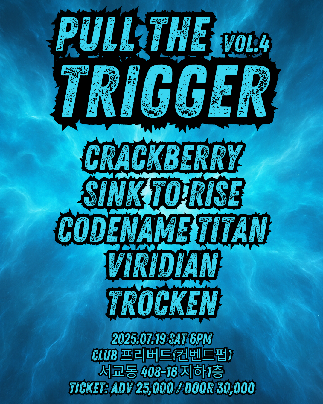 노머시 컴퍼니와 홍대 클럽 프리버드가 주최하는 기획공연 ‘풀 더 트리거(Pull The Trigger)’가 오는 2025년 7월 19일 홍대 클럽 프리버드 리부트(컨벤트 펍)에서 개최된다. 풀 더 트리거는 지난 2025년 4월 13일 첫 공연을 시작해 ‘매달 홍대 클럽 프리버드에서 진행되는 Nomercy Day!’를 주창하며 매월 개최하는 행사로 이번 공연이 네 번째다. 이번 공연에는 트렌디한 메탈을 추구하는 크랙베리(Crackberry), 청주 하드코어 전통의 명맥을 잇는 싱크 투 라이즈(Sink To Rise), 폭발적인 사운드의 코드네임 타이탄(Codename Titan), 신비로운 여성 보컬의 음색과 메탈이 만난 비리디안(Viridian), 그리고 국내 유일의 람슈타인(Rammstein) 트리뷰트 밴드 트라켄(Trocken)이 함께 무대를 꾸밀 예정이다.